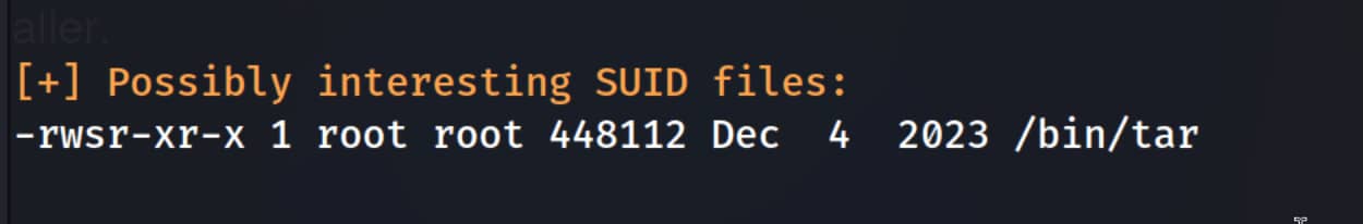 This part of the output stands out. It shows there is a file with the SUID bit set.