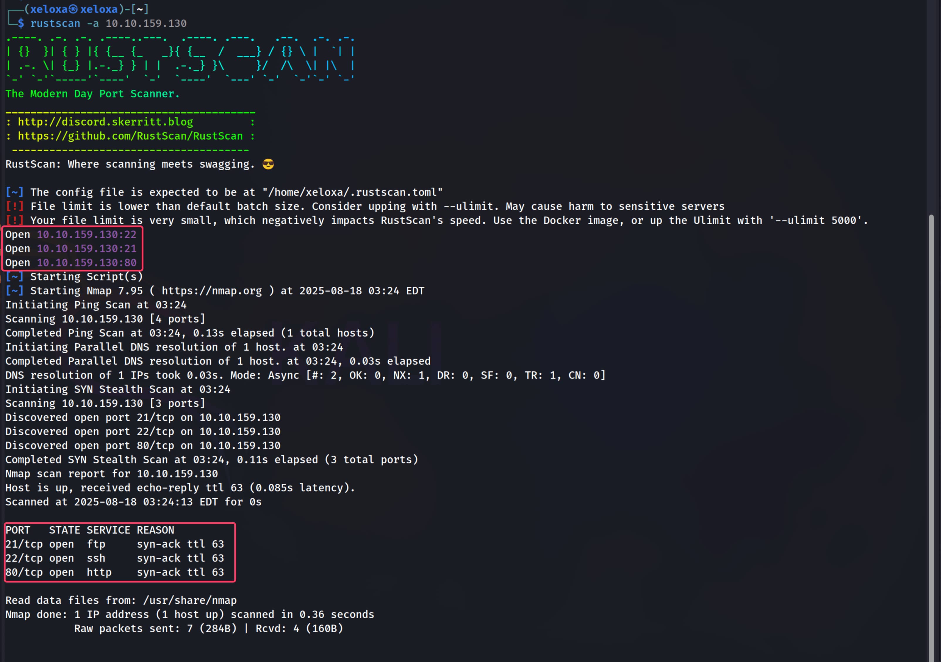 As a first step, let's run a port scan against our target. For speed, we first sweep all ports with rustscan